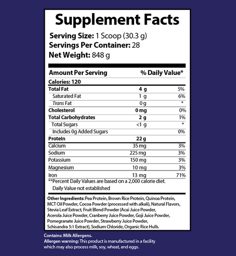 Our Plant Powered Chocolate Vegan Protein features 22 grams of vegan protein sourced from Quinoa, Brown Rice, and Pea Isolate. This powerful trifecta of plant-based proteins provides amino acids, vitamins, and minerals that your body needs to repair itself and build muscle. As a bonus, this protein blend contains a complex of 11 different superfruits, providing antioxidants to support your overall health.